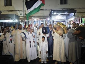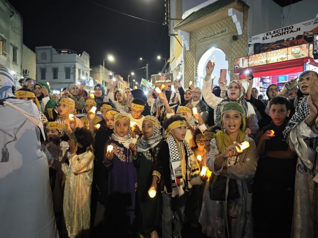 وفيما ارتدى الأطفال اللباس التقليدي المغربي وحملوا الشموع والشارات توشح الشباب والكهول بالكوفيات وحملوا الأعلام الفلسطينة ورددوا أناشيد وأمداح نبوية في لوحة جميلة تجسد معاني المحبة والإرتباط بالجناب الشريف وتؤكد على مواصلة النصرة والدعم والاسناد لأهل غزة والضفة والقدس والمسجد الأقصى المبارك.