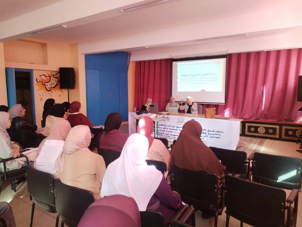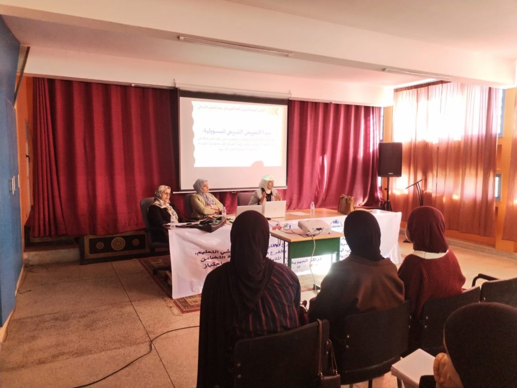 تلتها الأستاذة كلثوم همار التي تناولت المرحلة الثانية (المستويات الرابع والخامس والسادس)، موضحة آليات بناء الكفايات وتخطيط الدروس والتقويم التكويني.